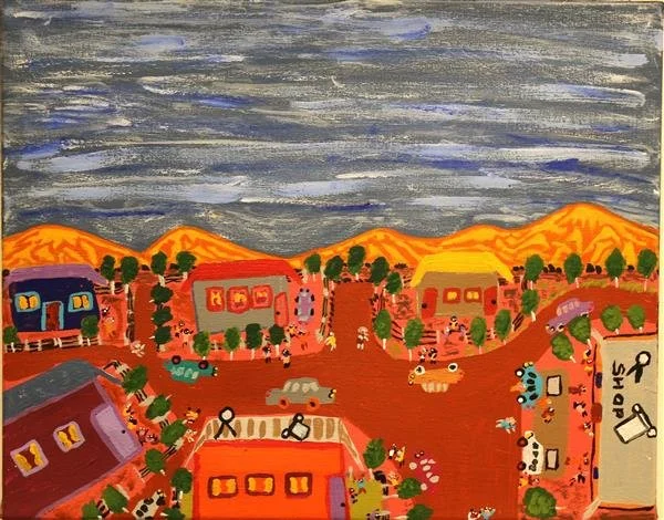 'Three houses in Hermannsburg, family houses at Sandhill Camp. That's like our family area at Hermannsburg. The families are sitting down outside watching tourist cars coming to Alice Springs.’