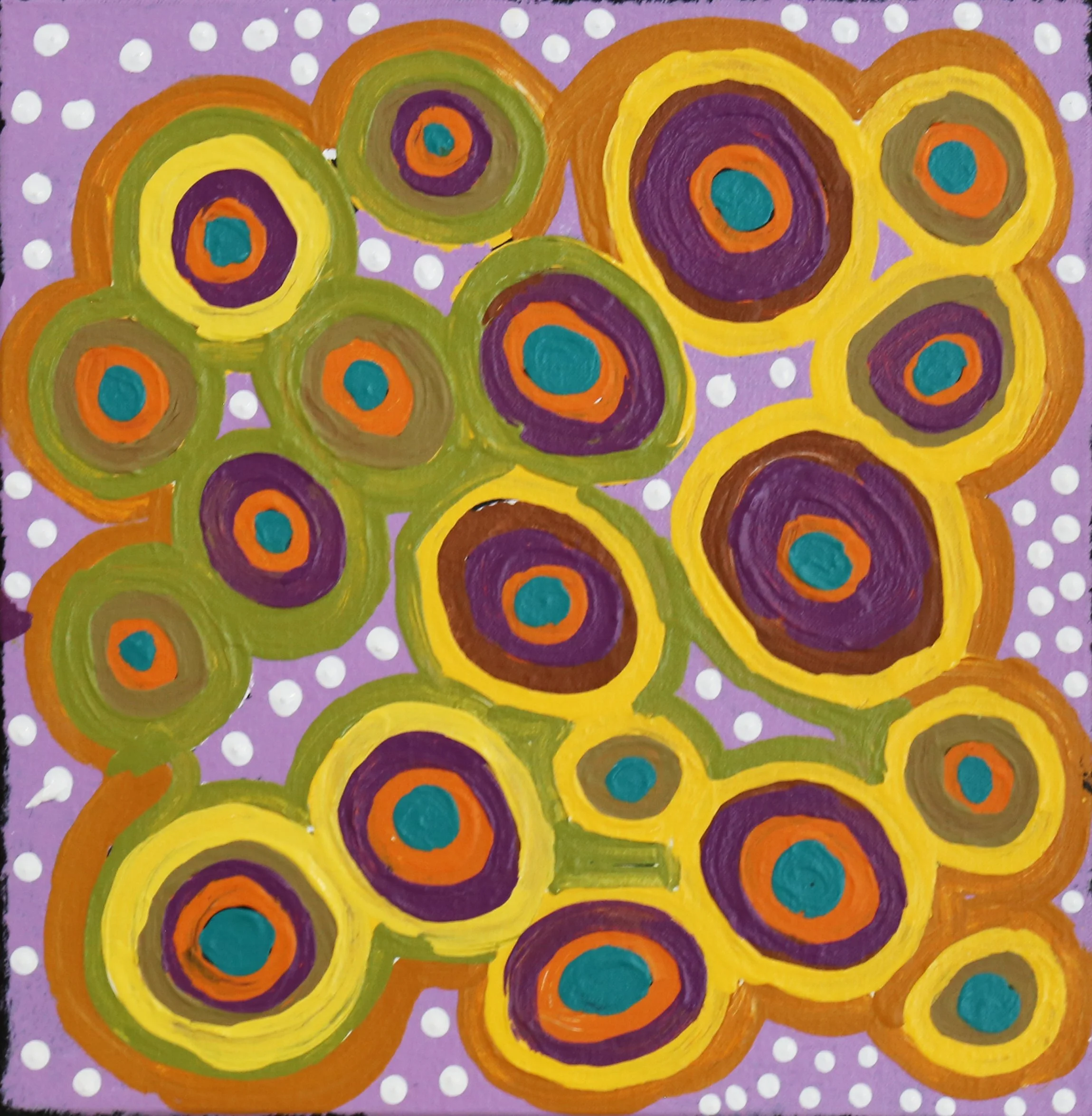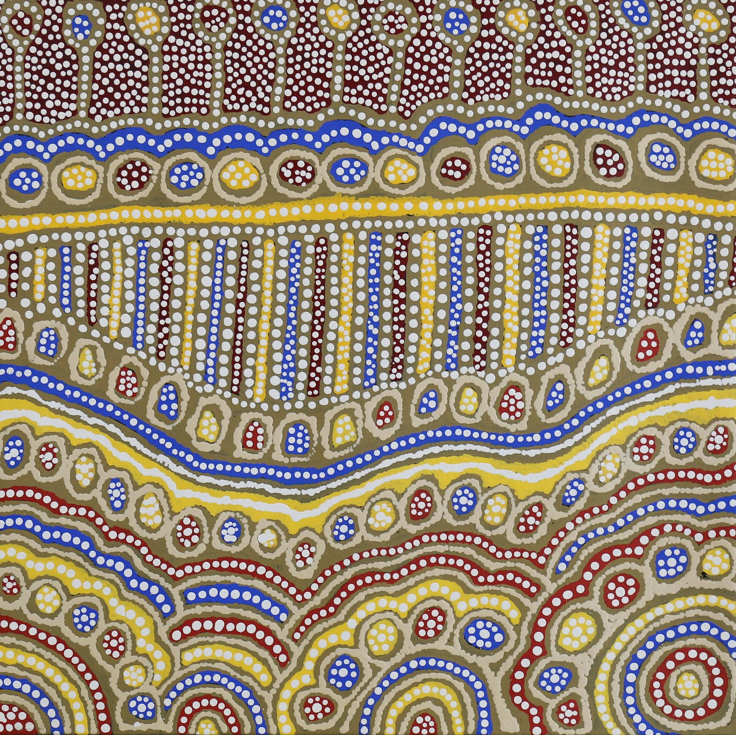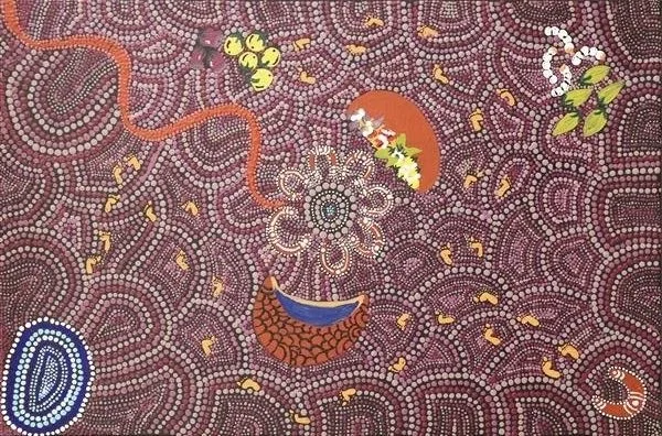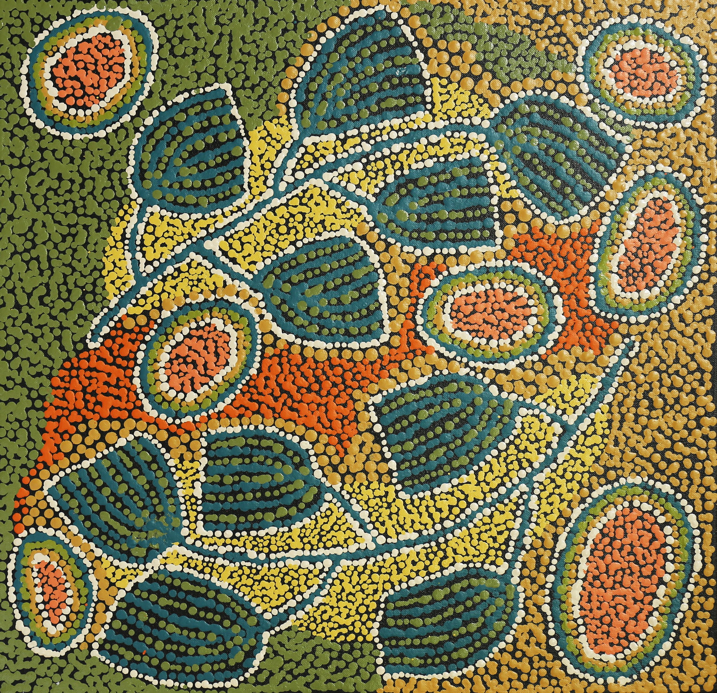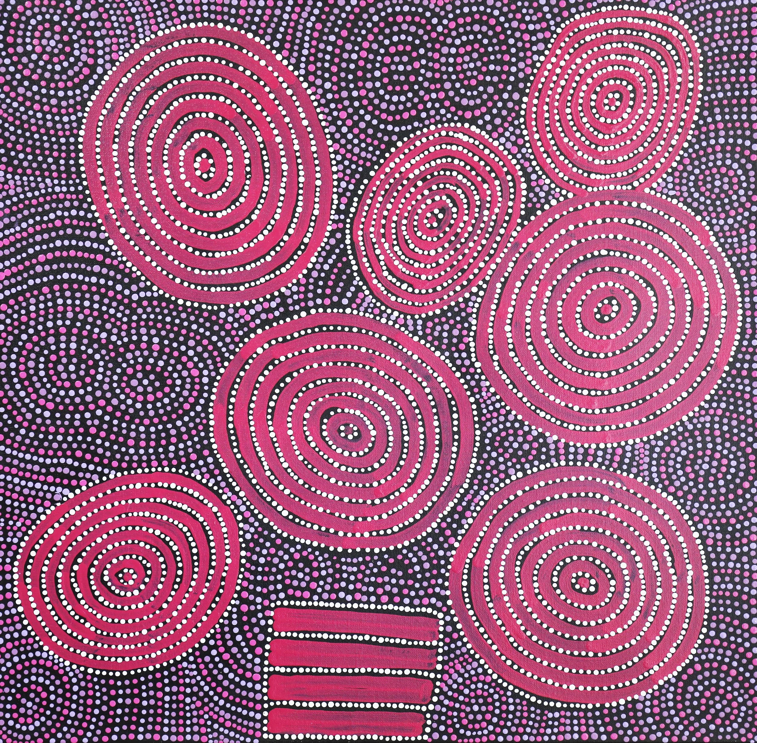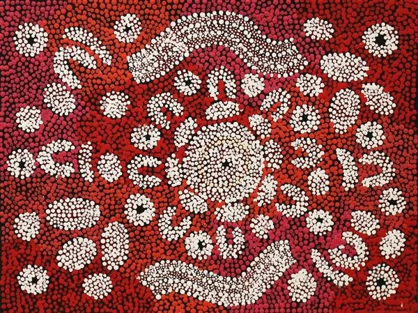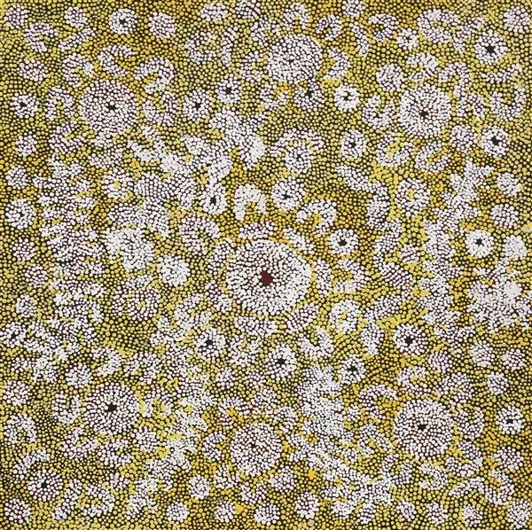 ‘This painting represents Water Dreaming (also called Kapi, or Ngapa Tjukurrpa), from Karrinyarra and Central Mt Wedge, north of Papunya. The circles are the water holes, and this site is strongly associated with rain making ceremonies.’