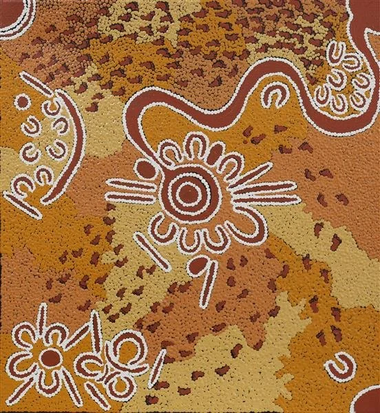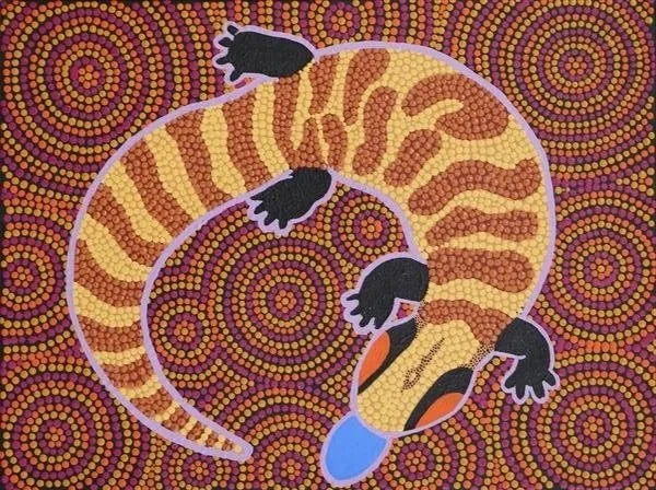 ‘This painting is about the Lungkata (Blue Tongue Lizard). He walks all over the countryside.’