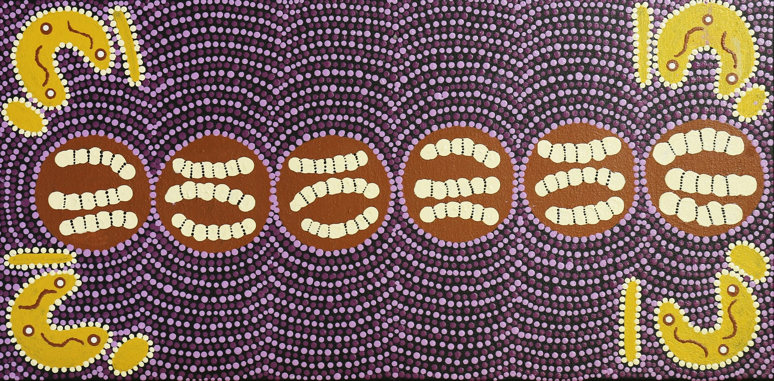 'This painting is about the way women hunt Wardapi – that sand goanna. He digs holes in the dunes, makes his nest deep inside. Many of the holes all join up. Women hunt Wardapi in the dunes by digging out the holes. Sometimes cover one, and Wardapi runs out other one. Need to hunt him together. Find all the holes. Dig them at the same time. Someone going to get him that way.’